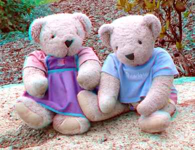 In this picture Theodore is wearing his fishing outfit while Tilly-Bear wears her sewing dress.