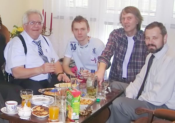 After lunch we sat around the living room and talked for over three hours. (Left to right) Lance, Daniel (Bozena and Jan’s son), Jan Scholtz (Bozena’s husband), and Dusan. Jan, Bozena’s husband, brought out a bottle of plum brandy that Dusan’s father made 10 years ago. I only took one very small sip of it. You really feel it going down. They said is was 65 proof but after 10 years I think something must have happened.