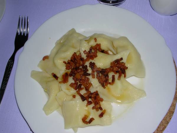 When we got home, Silvia served Lance his favorite Slovak dish: Pirohy which she made herself from scratch. These Pirohy were filled with potato and bryndza (special Slovak cheese) and had bacon bits on top. Pirohy are always sauteed in butter, never margarine.