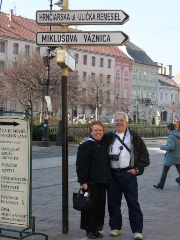 With Kosice in the background, Dianne and I stand next to a sign with the word Miklusova on it. Did they name a street using our family name? No.