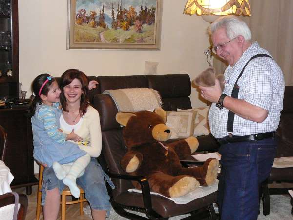 Ivanka brought out two teddy bears that she wanted me to meet. Neither she nor her mother speaks English. First, I played with the little bear as shown in the photo above. Then I picked up the large bear that was sitting in the chair. I poked my finger in the big bear’s stomach and said, “Tickle, tickle, tickle!” Ivanka exploded into laughter.